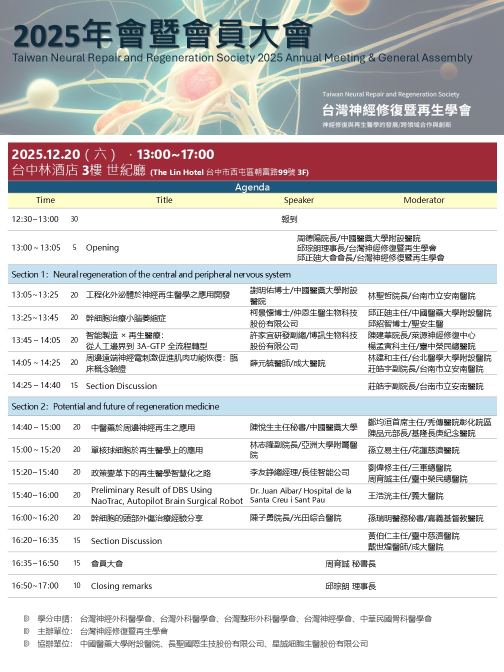 年會暨會員大會活動花絮 地 點:台中林酒店 3樓 世紀聽(The Lin Hotel 台中市西屯區朝富路99號 3F) 參加對象:對神經修復、再生醫學領域有興趣之人員 演講時間:114年12月20日(星期六)12:30~17:00 ◌學分申請:社團法人台灣神經外科醫學會、台灣外科醫學會、台灣整形外科醫學會、台灣神經學學會、中華民國骨科醫學會 如有任何問題,請與學會秘書處聯絡:tnrr2024@gmail.com,03-8241222